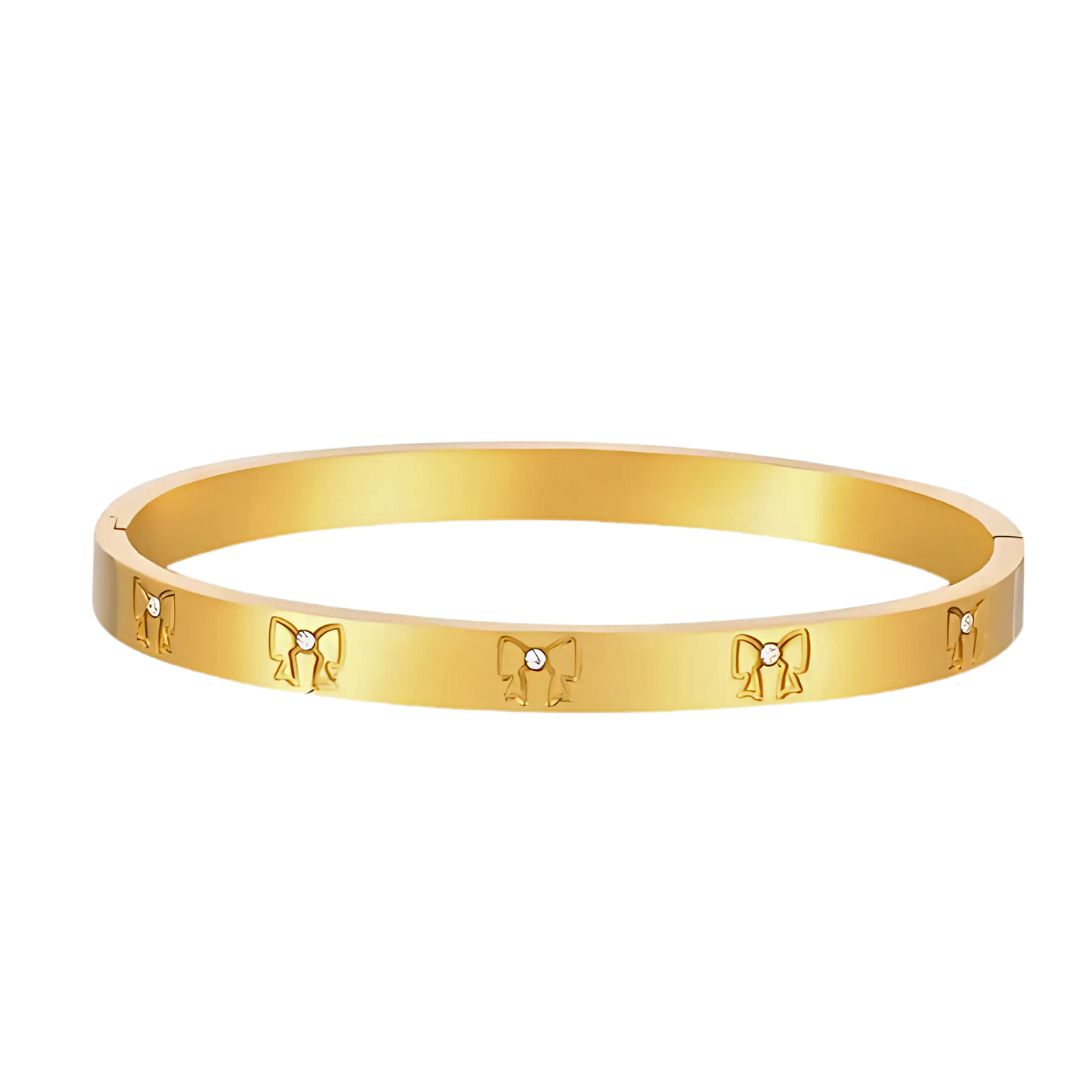 Elevate your jewellery collection with the Chloe Bow Bracelet in Gold, a refined piece that combines delicate craftsmanship with understated glamour. Each bow is meticulously etched and accented with sparkling cubic zirconia. Its unique design balances elegance with charm, making it an exquisite choice for those who appreciate timeless beauty with a modern twist.