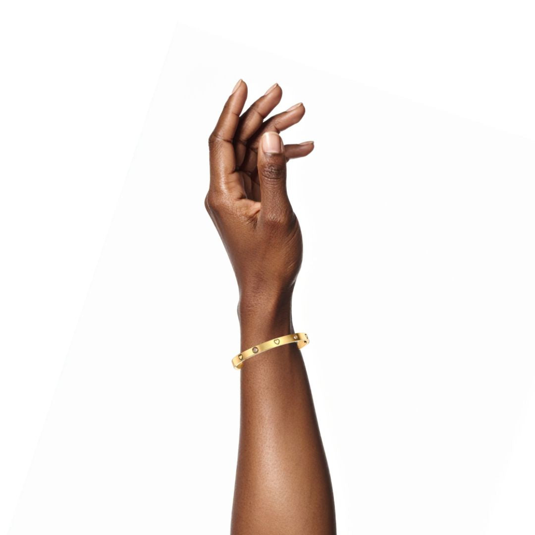 Add sparkle to your stack with this gold heart bracelet featuring clear cubic zirconia accents and etched heart detailing. Also available in silver.