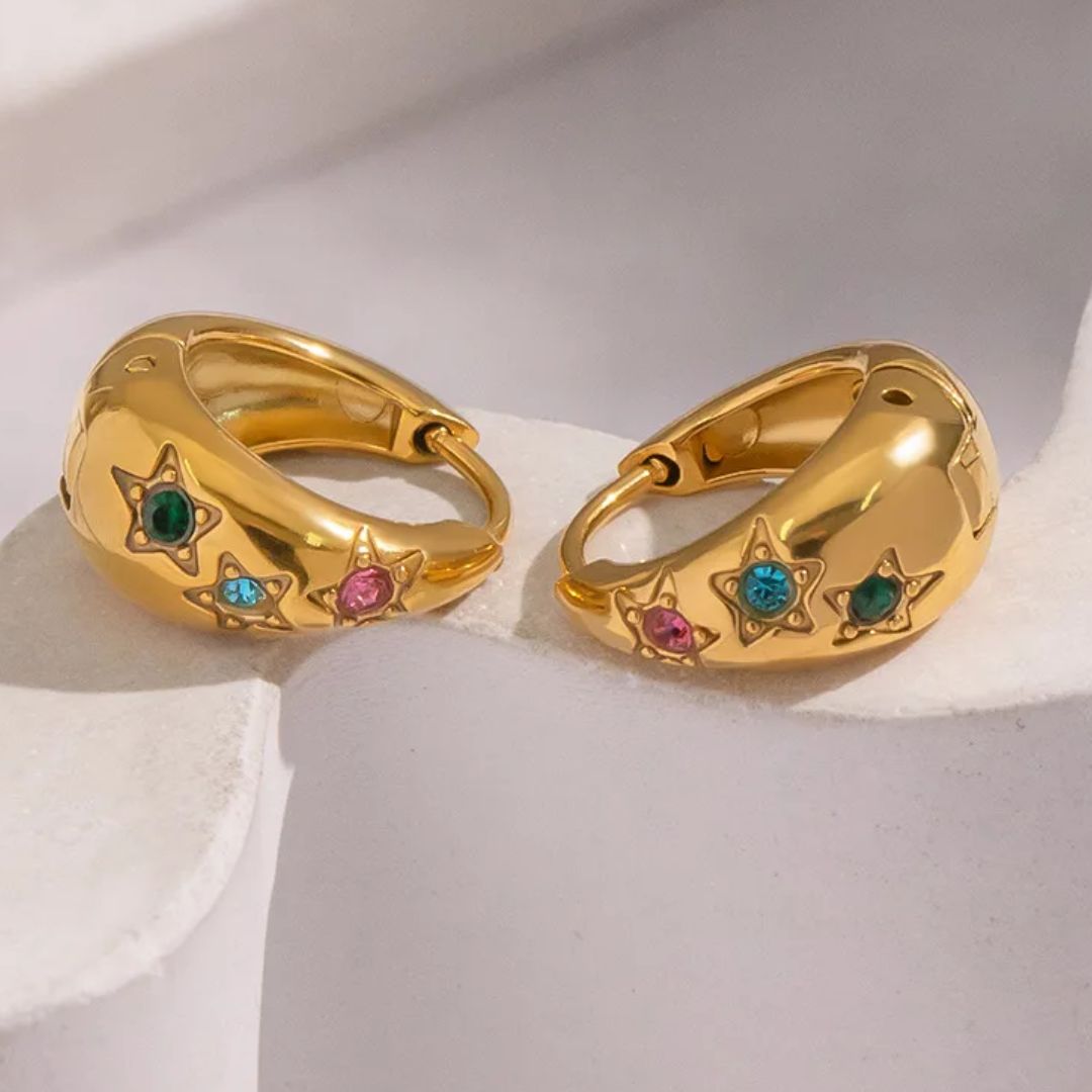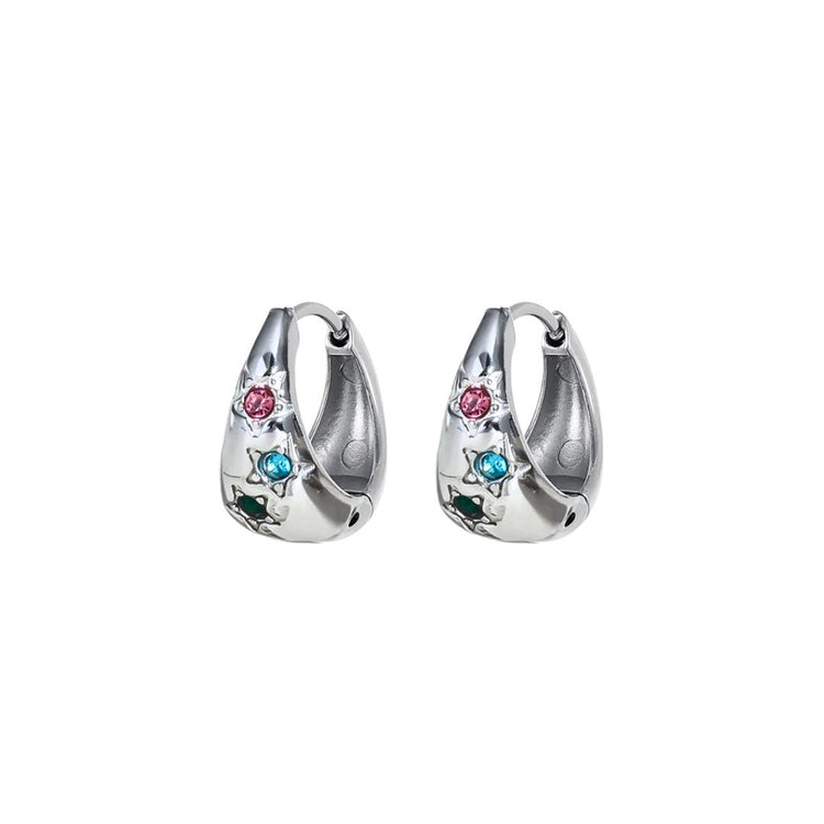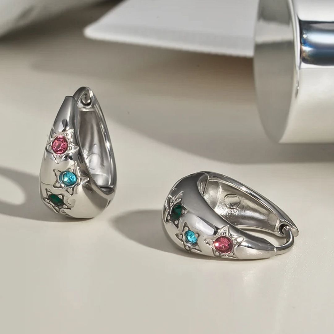 Thoughtfully crafted in water resistant stainless steel, these hoops feature delicate star-shaped cubic zirconia insets on one side. Also available in black and clear.